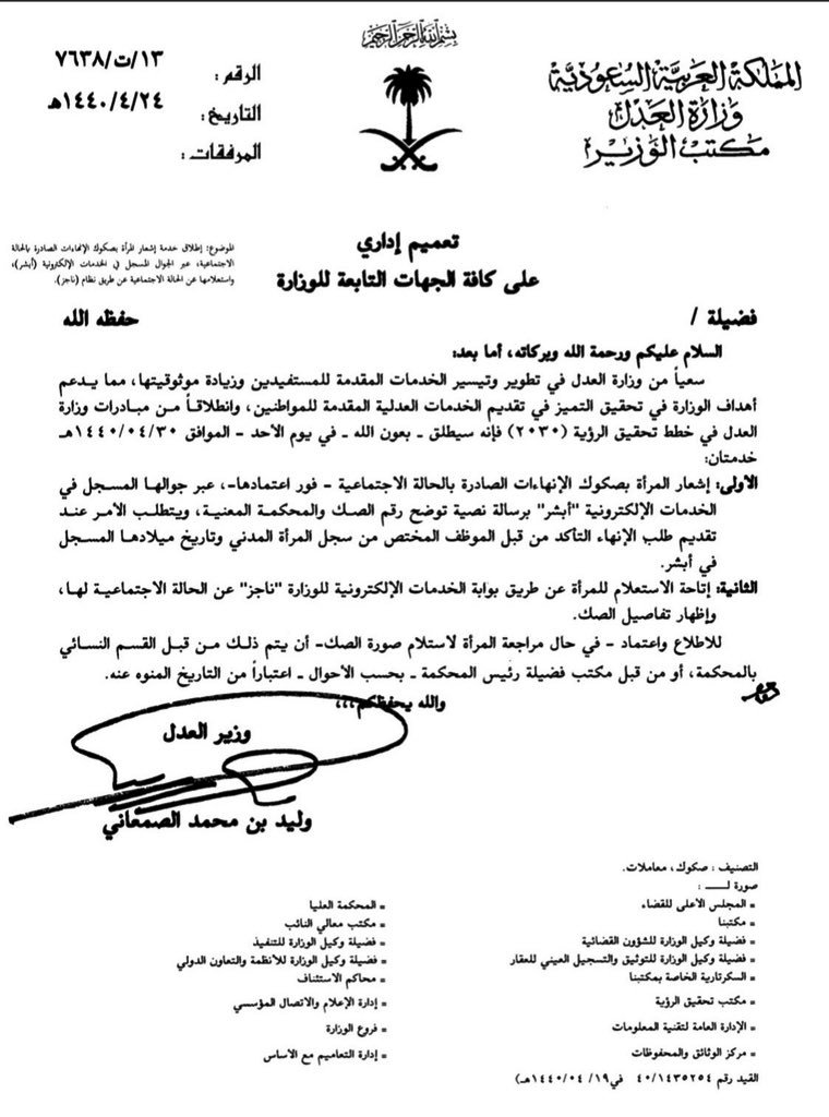 مختارات عدلية Twitterren تعاميم وزارة العدل بتاريخ ١٤٤٠ ٤ ٢٤هـ إشعار المرأة بصكوك الإنهاءات حول الحالة الاجتماعية وما يطرأ عليها برسالة جوال والاستعلام عن حالتها الاجتماعية التأكيد على